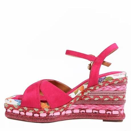 様々なテクスチャと装飾を巧みに組み合わせたボニーウェッジサンダルは、繊細な織りのディテール、ラインストーンのアクセント、そして大胆でフェミニンな雰囲気を醸し出すフローラルプリントのインソールが特徴です。