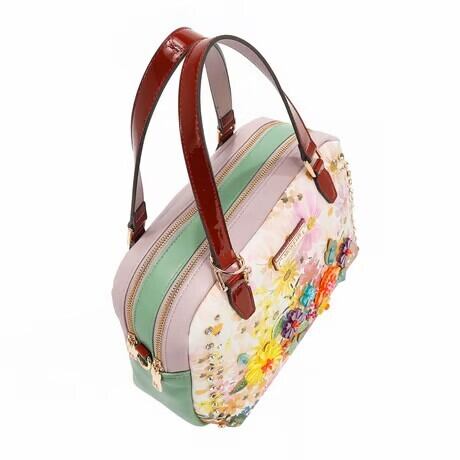 パステルカラーの花びらときらめく装飾が織りなすドラマティックなハンドバッグ。柔らかな曲線と輝く花のアップリケが旅への情熱と咲き誇る夢の物語を紡ぎます。