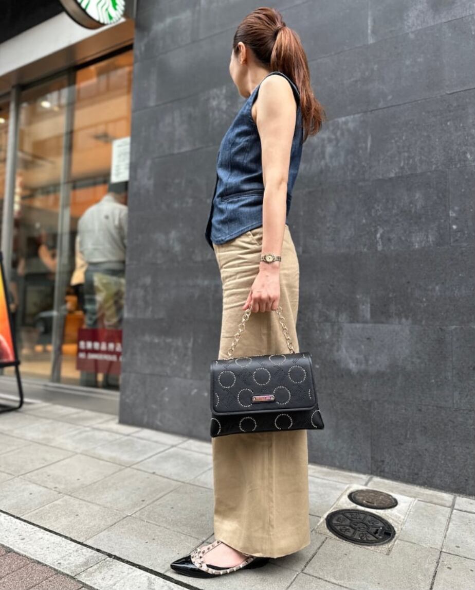 トレンドのチェーンディテールがコーディネートを華やかに演出し、シンプルなコーデとも相性抜群です。